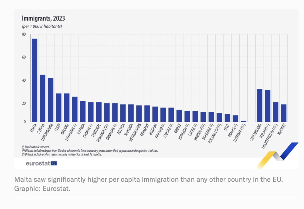 - Times of Malta (2025) Malta’s immigration rate was 75% higher than any other EU state’s in 2023. Available at https://timesofmalta.com/article/malta-immigration-rate-75-higher-eu-state-2023.1107434 (Accessed: 30 April 2026).
